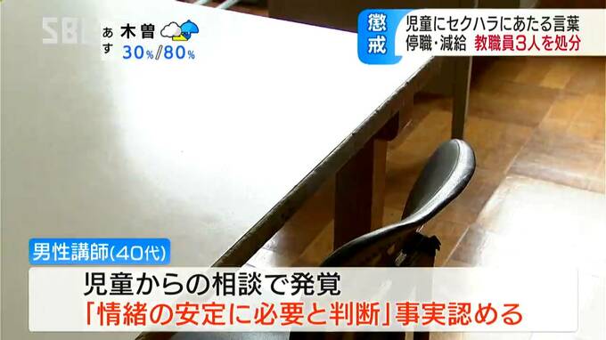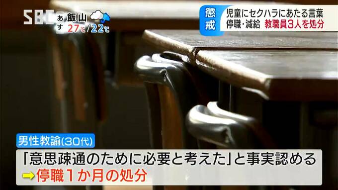 児童に対し、セクハラに当たる言動を行ったとして、小学校の男性教諭2人が停職処分に、また、同僚の女性教諭にセクハラ行為を行った中学校の男性教諭が減給処分となりました。