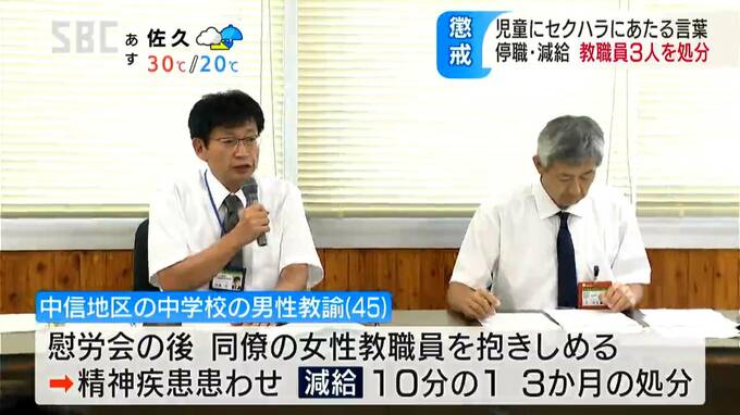 このほか、中信地区の中学校に勤務する45歳の男性教諭が、今年4月、学校行事の慰労会の2次会のあと、同僚の女性教職員を複数回抱きしめるなどし、ストレスによる精神疾患を患わせたとして、3か月の減給処分を受けました。