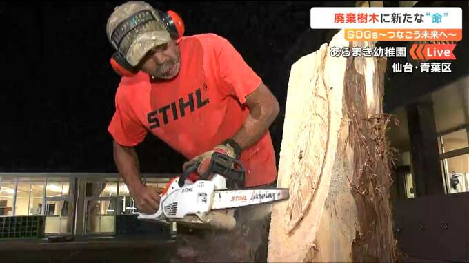 特集は「SDGsつなごう未来へ」。今回は仙台市内の幼稚園から中継でお伝えします。この幼稚園には去年まで樹木が生い茂っていました。本来なら伐採後に廃棄されるはずだったこれらの樹木に、「ある方法」で命を吹き…