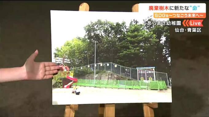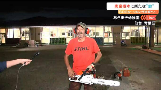 特集は「SDGsつなごう未来へ」。今回は仙台市内の幼稚園から中継でお伝えします。この幼稚園には去年まで樹木が生い茂っていました。本来なら伐採後に廃棄されるはずだったこれらの樹木に、「ある方法」で命を吹き込んだ男性がいます。いったいどんな方法なんでしょうか?