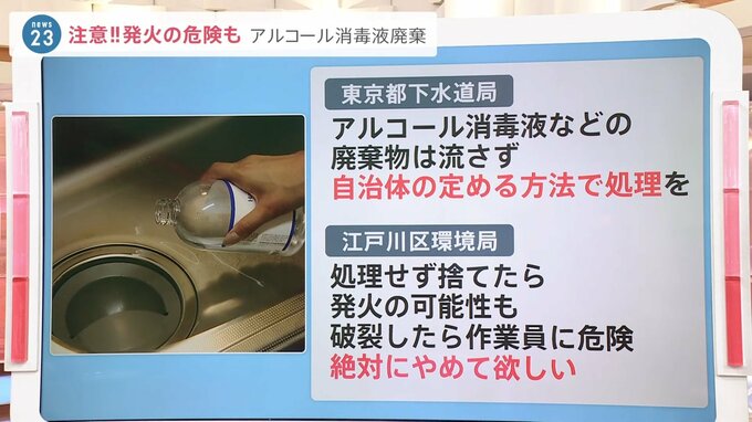 流して捨てていいのかどうなのか?東京都下水道局に聞いてみたところ、「アルコール消毒液などの廃棄物は流さないでください」ということです。自治体の定める方法で処理をしてください。