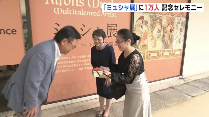 ひろしま美術館(広島市)で開かれている「ミュシャ展」の入館者が15日、1万人を達成し、記念のセレモニーが行われました。1万人目となったのは、広島県廿日市市から来た 村上晴香 さんです。ひろしま美術館の 角…