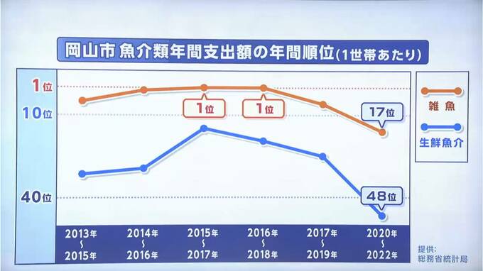 ーこちら【画像①】をご覧ください。これは岡山市民が、年間どれほどの雑魚を購入しているかを示した表です。2015年ごろには1位だったものの最近は17位まで順位を下げています。