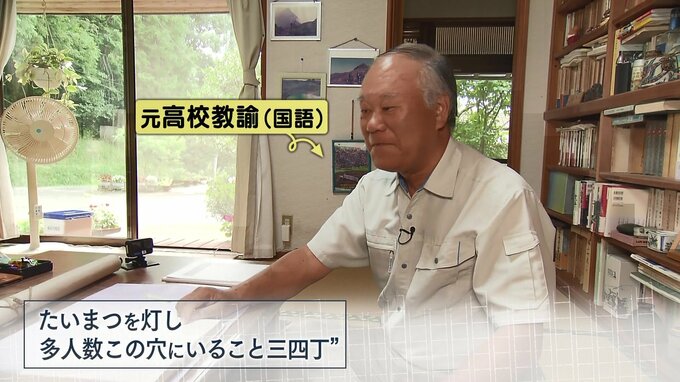 「松まつを灯し、多人数この穴にいることおよそ三四丁とここに書いてありまして、天保年間(1831―1845)に村人が大量にこの穴の中に入ったと書いてあるんですよ。」
