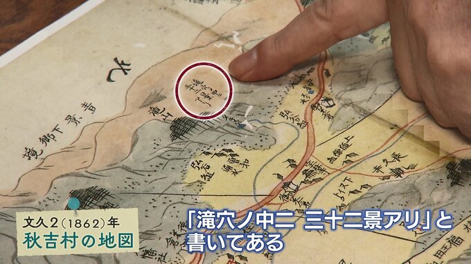 「実はこれが文久2年(1862)の秋吉村の地図ですけどこの上に、”滝ノ中ニ三二景アリ”と書いてある」