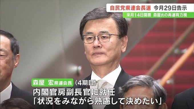 現在の自民党県連の会長は森屋宏参議院議員が4期目を務めていますが、今回の内閣改造で内閣官房副長官に就任していて、14日夜UTYの取材に対し、県連会長選挙については「状況をみながら熟慮して決めたい」と態度を明確にしていません。