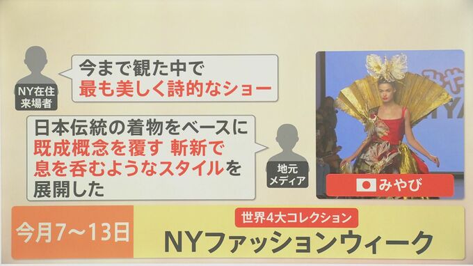 どのブランドを呼ぼうかという会議が行われまして、その中でこの「みやび」の名前が挙がった。世界的に見ても優れた感覚、ゴージャスな着物文化を世界に発信してほしいという意見があって、実際ニューヨーク進出が決まったということです。そこに至るまで9か月で12着、一気に作り上げたということです。