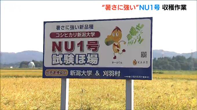 17日、新潟県刈羽村で行われた『コシヒカリ新潟大学NU1号』の稲刈り。NU1号は新潟大学農学部の三ツ井敏明教授らが「暑さに強いコメ」を目指し開発した品種です。