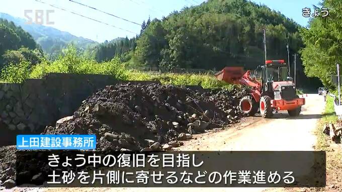 上田建設事務所は18日中の復旧を目指し、午前9時頃から土砂を片側に寄せるなど作業を進めています。