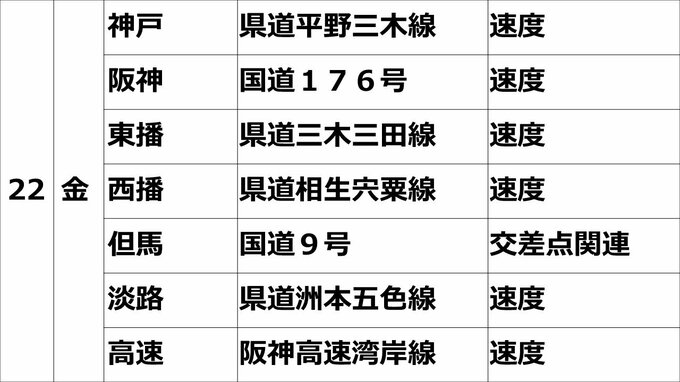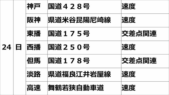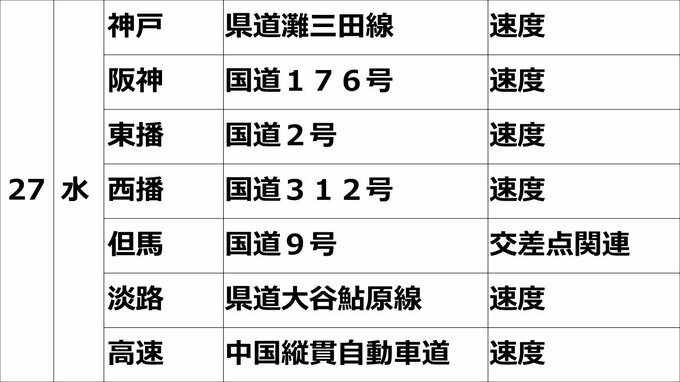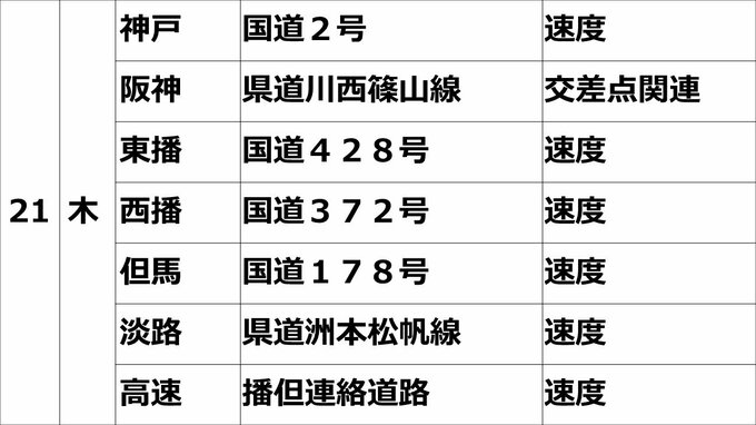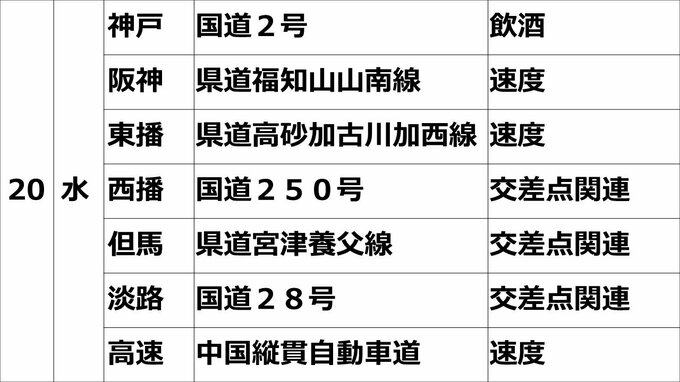 20日(水)【神戸】国道2号ー飲酒 【阪神】県道福知山山南線ー速度 【東播】県道高砂加古川加西線ー速度 【西播】国道250号ー交差点関連 【但馬】県道宮津養父線ー交差点関連 【淡路】国道28号ー交差点関連 【高速】中国縦貫自動車道ー速度