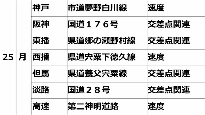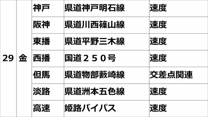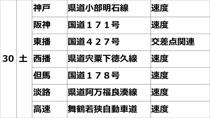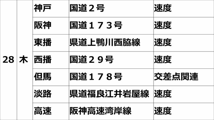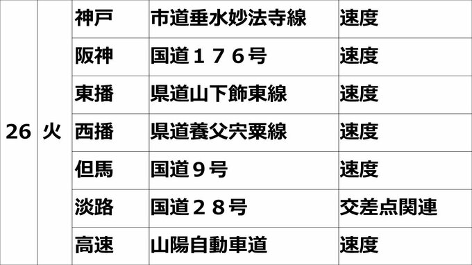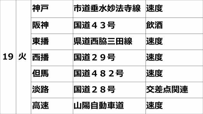 19日(火)【神戸】市道垂水妙法寺線ー速度 【阪神】国道43号ー飲酒 【東播】県道西脇三田線ー速度 【西播】国道29号ー速度 【但馬】国道482号ー速度 【淡路】国道28号ー交差点関連 【高速】山陽自動車道ー速度