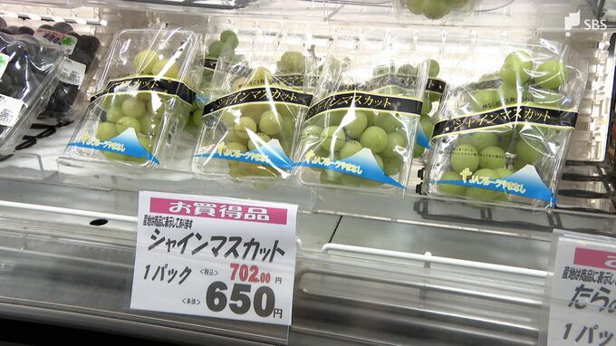 糖度が高く、皮ごと食べられる「シャインマスカット」。例年は1000円ほどで売られているといいますが、2023年は700円前後と異例の安さとなっています。