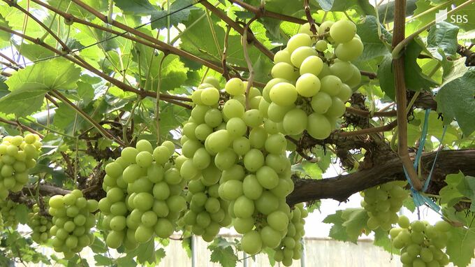 旬を迎え、きらきらとイエローグリーンに輝く「シャインマスカット」。しかし、生産者の杉本さんは、2023年は納得のいくものではなかったと話します。