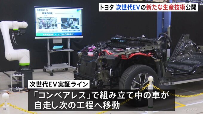 トヨタ自動車は、次世代のEV=電気自動車の生産技術を公開しました。大型プレス機で車台の一部を一体成型する「ギガキャスト」や車を自動で走らせながら組み立てる「コンベアレス」の新技術で組み立て時間の半減を…
