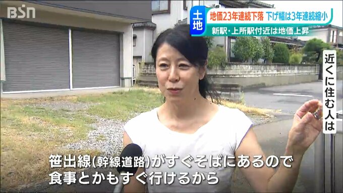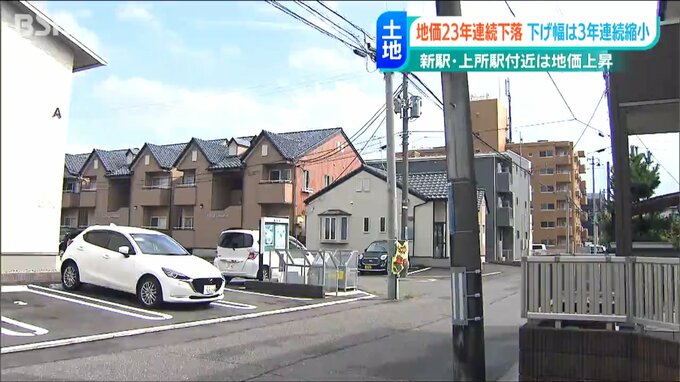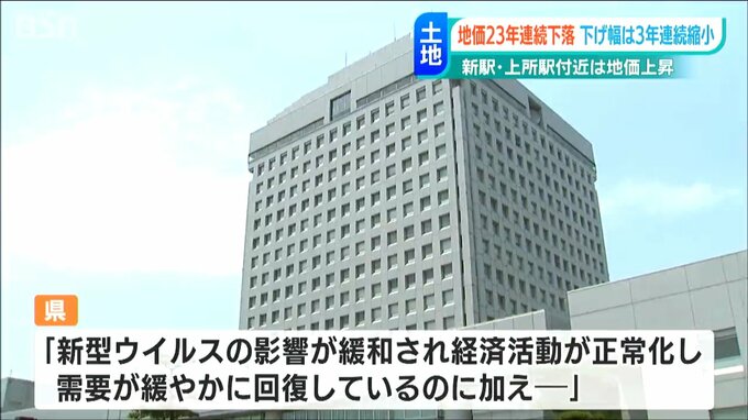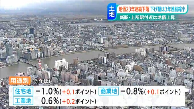 ただ、用途別の変動率は住宅地と商業地で去年より0.1ポイント、工業地で0.2ポイント改善し、全体の下げ幅は3年連続で0.1ポイント縮小しました。