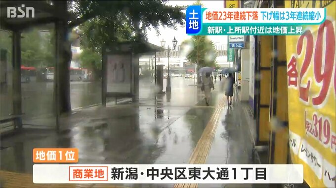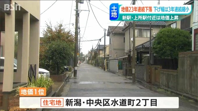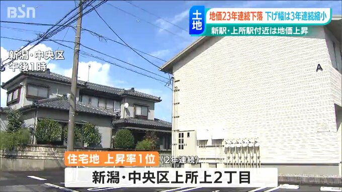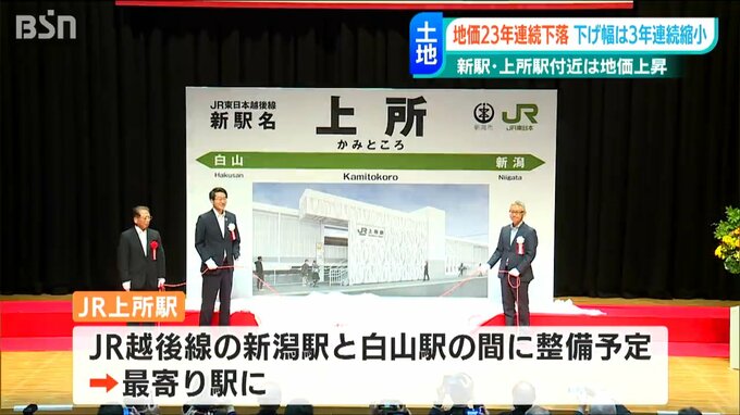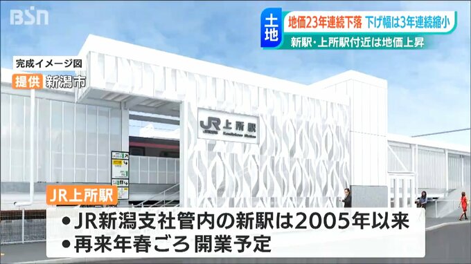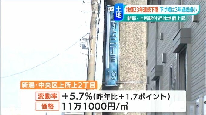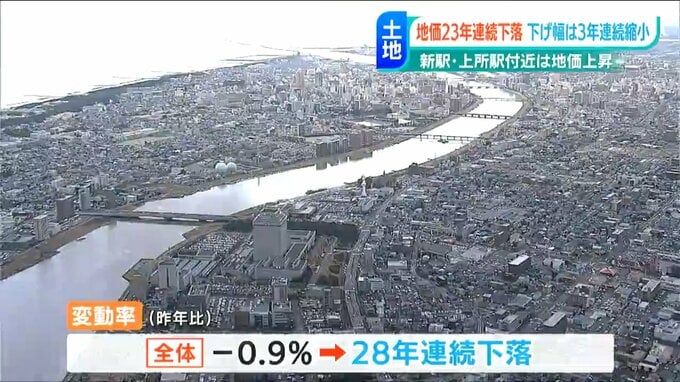 土地取引の目安となる地価の調査結果が発表され県全体は28年連続で下落しました。ただ、下げ幅は3年連続で縮小し、JR越後線に新たに設置される上所駅の付近は地価の上昇が続いています。