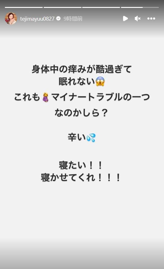 手島さんはストーリーズに「身体中の痒みが酷過ぎて眠れない」と書き出し「これもマイナートラブルの一つなのかしら?」と妊娠した女性の絵文字とともに問いかけています。そして「辛い 寝たい! 寝かせてくれ!!」と切実な苦しさを訴えています。