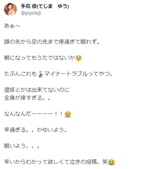 手島さんは「湿疹とかは出来てないのに全身が痒すぎる。。」と続け「なんなんだーーーー!! 辛過ぎる。。かゆいよう。眠いよう。。。」と嘆いています。
