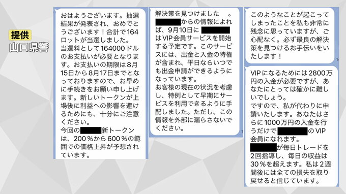 男性は、投資会社のアドバイザーを名乗る者などとはSNSでのやり取りのみで、電話などはしていないということです。