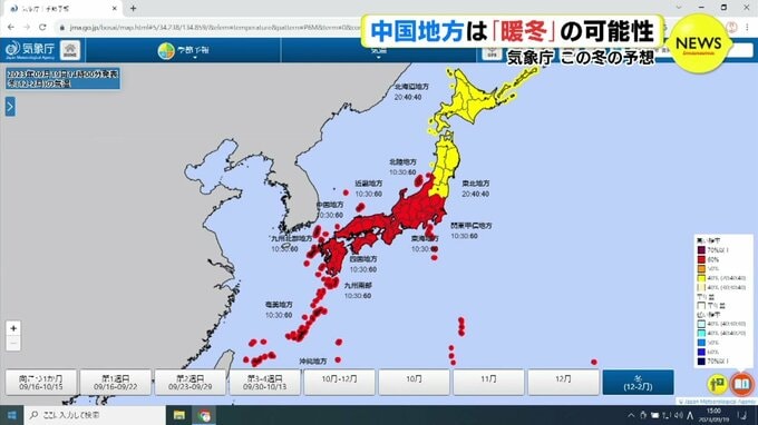 19日午後2時、気象庁はこの冬の天候の予報を発表しました。中国地方は「暖冬」になる可能性が高くなっています。気象庁は、9月のこの時期に、12月から翌年2月にかけての「冬の天候」の予報を発表します。それによ…