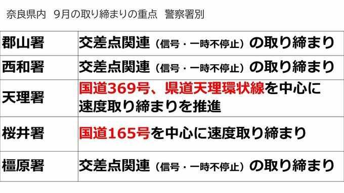 【最新】警察の交通取り締まりポイントはどこだ?『秋の交通安全運動』で強化される期間を含む9月19日~10月3日までの《要注意ルート》を全公開 奈良県編 毎日放送 2023年9月19日(火) 17:12 国内 【警察署ごとの取り締まりの重点】