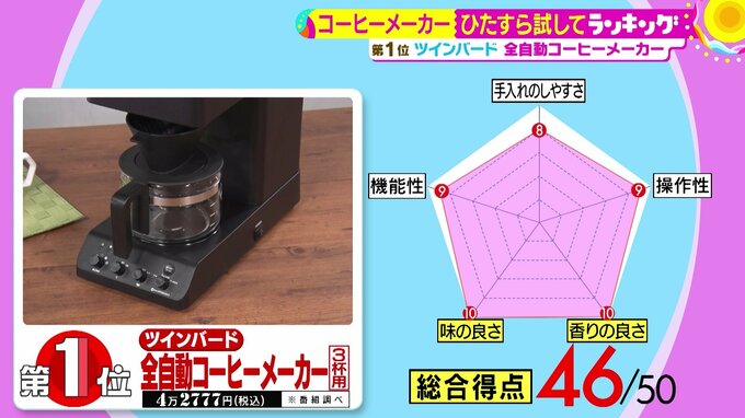 そして第1位となったのは、ツインバードの『全自動コーヒーメーカー(3杯用)』(税込42,777円 ※番組調べ)。