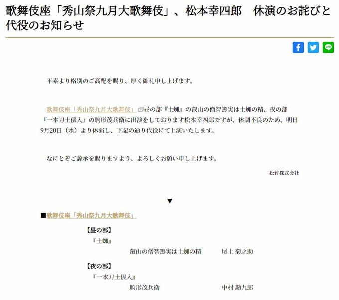 歌舞伎俳優の松本幸四郎さんが、体調不良のため、歌舞伎座「秀山祭九月大歌舞伎」を9月20日(水)より休演することが、歌舞伎情報の公式サイトで公表されました。