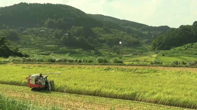 農林水産省の「つなぐ棚田遺産」にも認定されている岡山県美咲町の棚田で、稲刈りが最盛期を迎えています。黄金色に染まり、収穫の時を迎えた稲穂です。すり鉢状の地形におよそ750枚の棚田が広がる、美咲町大垪和…