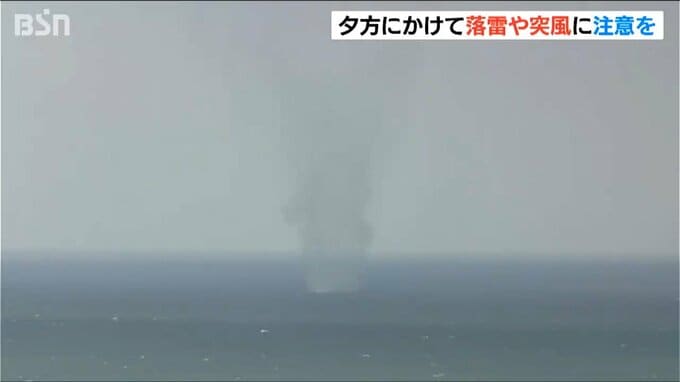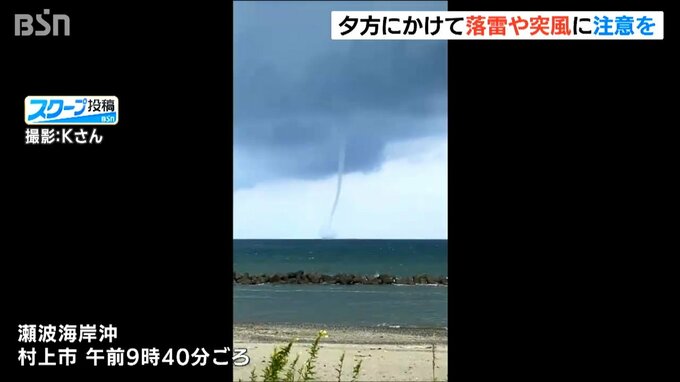 20日午前9時40分ごろ、新潟県村上市の瀬波海岸沖で視聴者が撮影した映像では、竜巻のような雲が海と上空の黒い雲をつないでいます。撮影者によりますと、他にも2本ほどこのような雲が見えたということです。