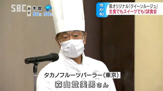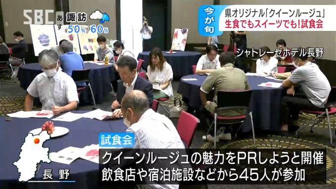 20日はクイーンルージュの魅力をPRしようと長野市で試食会が開かれ、飲食店や宿泊施設などから45人が参加しました。