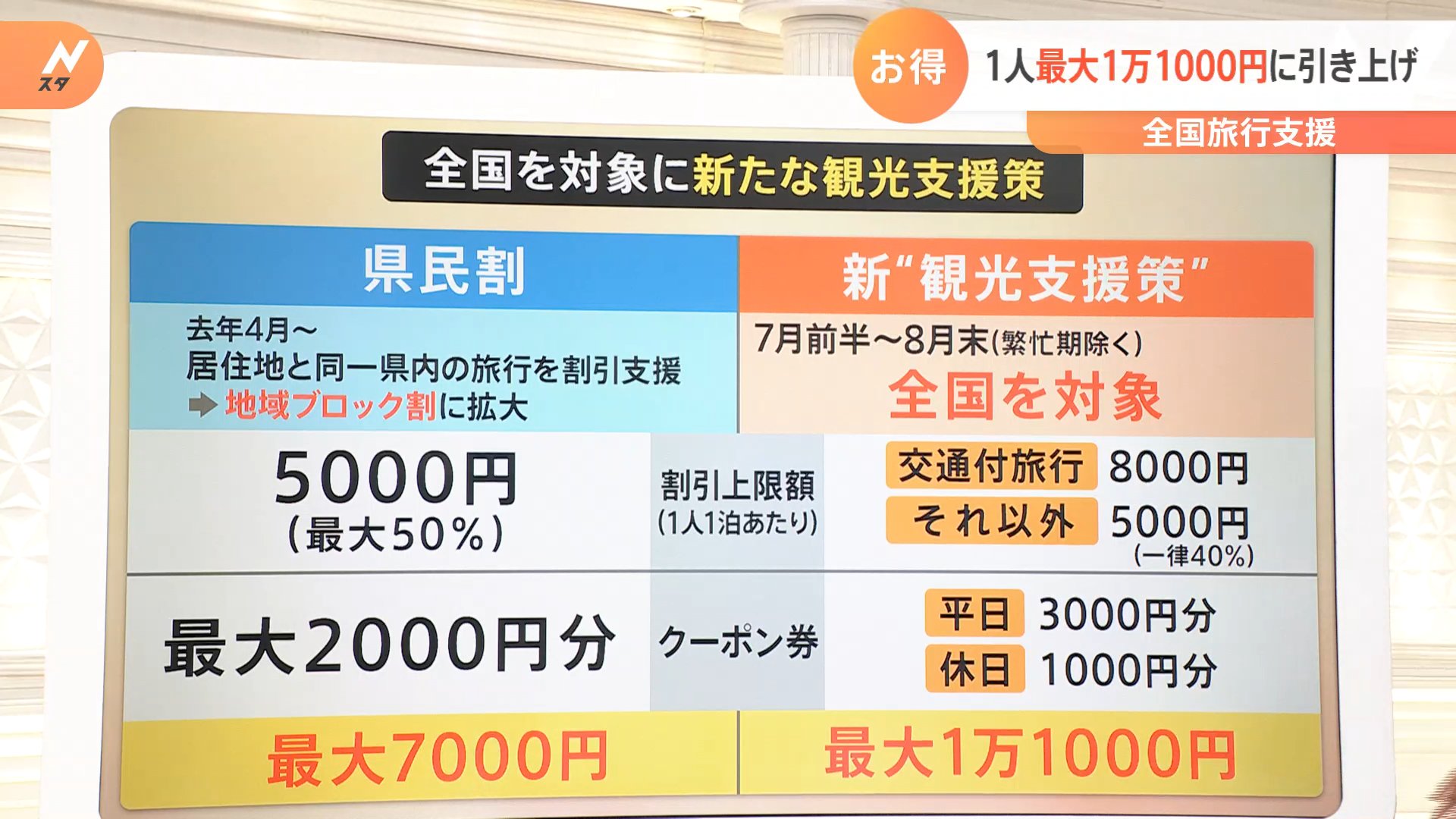 これを新たに拡大する、そして支援額を上乗せするというので、新しい“観光支援策”になりました。▼目処としては、7月前半あたりに始めたいとしています。「地域ブロック割」だったものを「全国」に対象を広げました。それに伴いまして割引の上限額も上がります。