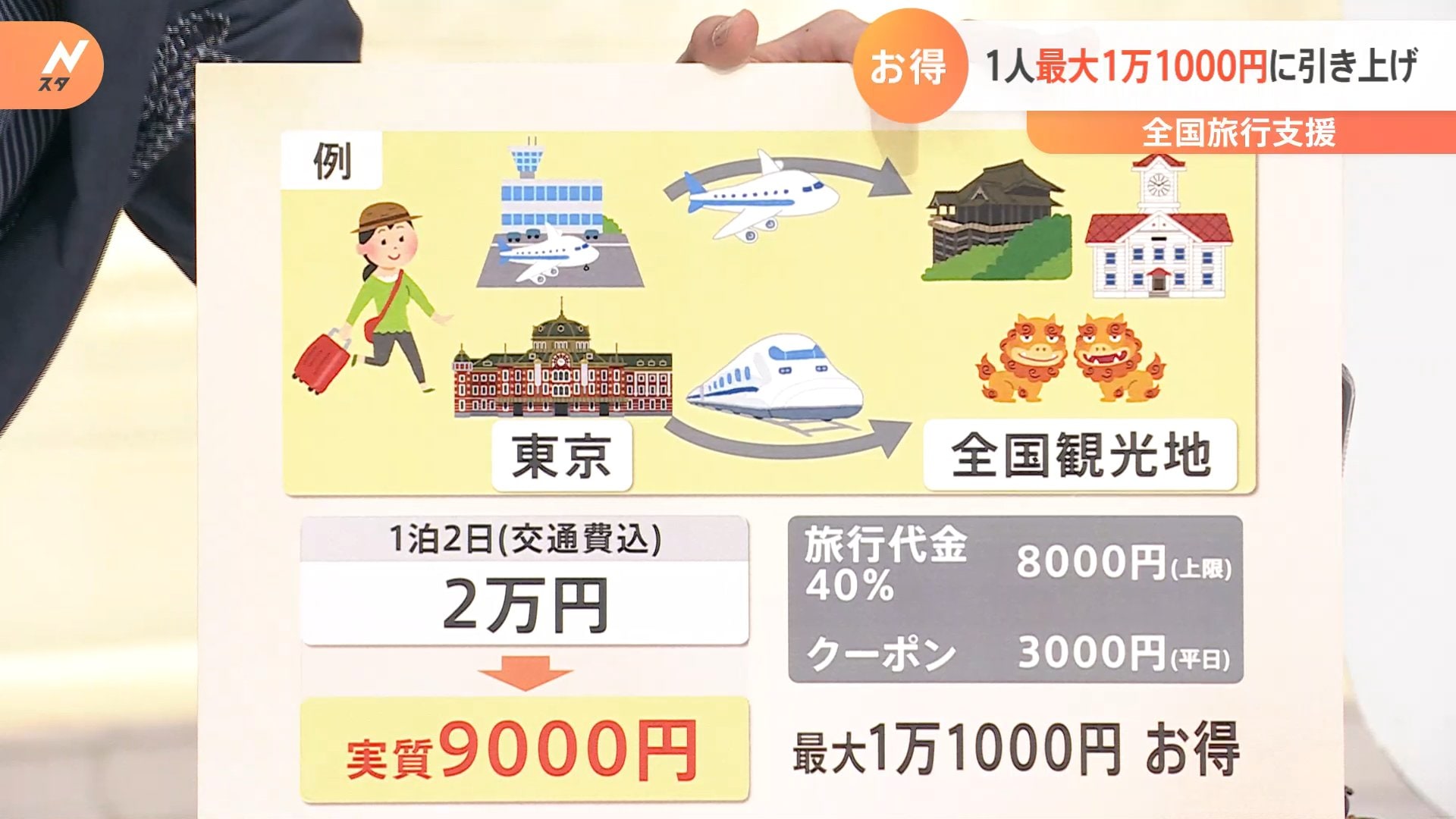 例えば、京都旅行をパック旅行で新幹線を使いますと、1泊2日交通費込みで「2万円」だったものが、旅行代金40%で最大値で8000円割引。後はクーポンの3000円がつきますので1万1000円。差し引くと、「実質9000円」で旅行することができるわけです。