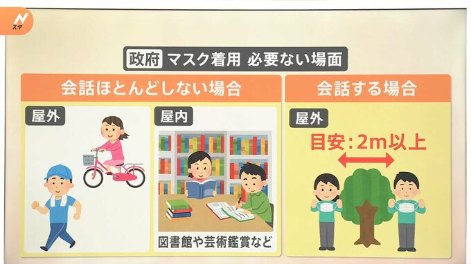 政府の考え方です。会話をほとんどしない場合、屋外ではもうマスクは必要ありません。また、屋内でも図書館や芸術鑑賞するときのように会話がほとんどないならば、目安として2メートルくらい離れてマスクはしなくても大丈夫ということです。