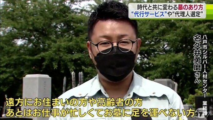 一方、まったく面識のない人の墓参りをする人もいました。墓参りの代行サービスです。八戸市シルバー人材センターの墓参り代行は彼岸やお盆を中心に毎年20件から30件ほどの依頼があるといいます。料金は内容にもよりますが2160円から5000円。墓石の掃除やお供え物、線香を立てて手を合わせるなど墓参りの一連の流れがすべて含まれています。