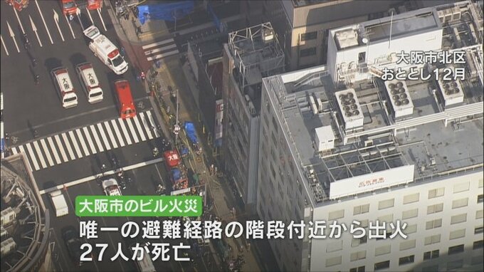 2021年12月、大阪市北区の雑居ビルで起きた火災では、唯一の避難経路である階段付近から出火したことで27人が死亡しました。