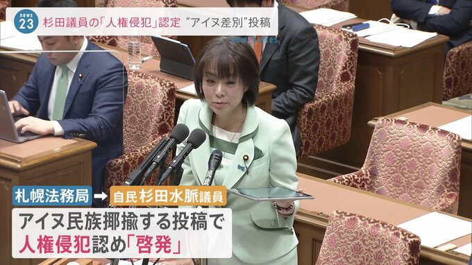 自民党の杉田水脈衆議院議員がSNSにアイヌ民族を揶揄する投稿をした問題で、札幌法務局が人権侵犯を認め、杉田議員に「啓発」を行ったことがわかりました。杉田議員は7年前、国連の会議の参加者について、SNSに「…