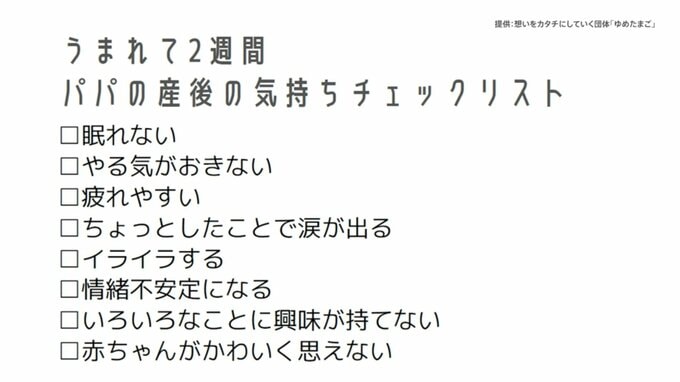 「やまなし版 父子手帳」というものが、2023年から山梨県内の一部の自治体で配布されています。民間の子育て支援団体が取り組んでいるんですが、中に「うまれて2週間 パパの産後の気持ちチェックリスト」というものがあって、▼眠れない▼やる気がおきない▼疲れやすい▼ちょっとしたことで涙が出る▼イライラする▼情緒不安定になる▼いろいろなことに興味が持てない▼赤ちゃんがかわいく思えない、こうしたことに1つでも当てはまるようであれば地域の保健師などに相談するようにすすめているということです。