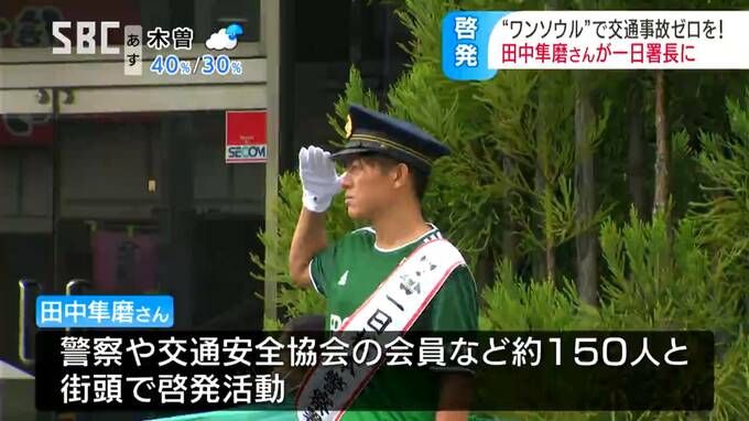 松本市で行われた交通安全運動の出陣式には、松本山雅の元選手・田中隼磨(たなか・はゆま)さんが登場。