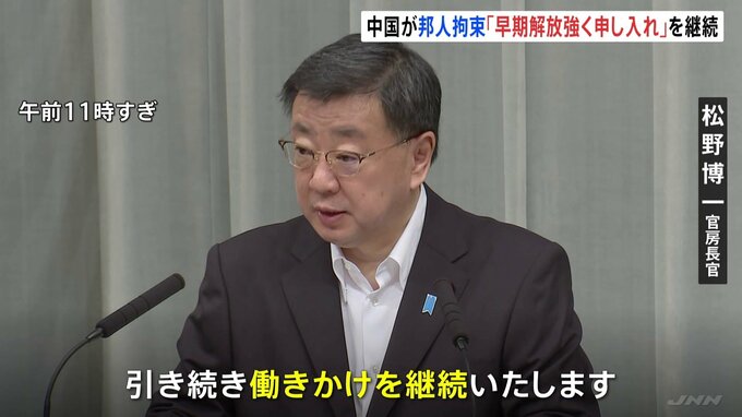松野官房長官は、中国にスパイ容疑で拘束されたアステラス製薬の日本人社員を中国当局が刑事拘留したことについて、早期解放に向け働きかけを続ける考えを示しました。松野博一官房長官「中国側に対しては様々なレ…