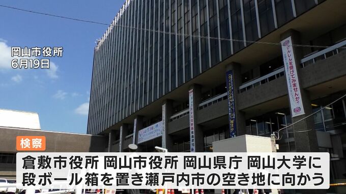 「倉敷市役所、岡山市役所、岡山県庁、岡山大学に段ボール箱を置き、報酬の受け取り場所である瀬戸内市の空き地に向かった―」