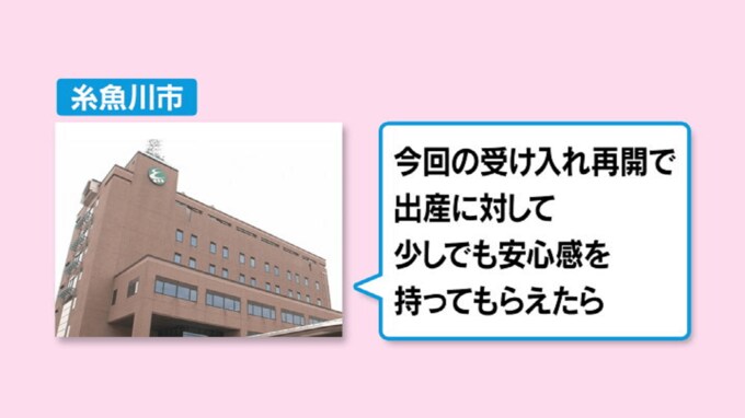 糸魚川総合病院が分娩受け入れを再開すると21日に発表したことについて、糸魚川市では「今回の受け入れ再開で出産に対して少しでも安心感を持ってもらえたら」としています。