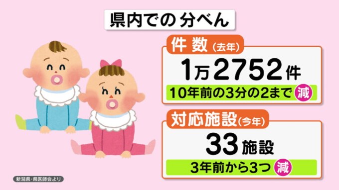 新潟県によりますと、2022年の分娩件数は1万2752件で10年前の3分の2まで減少していますが、現在分娩を受け入れている県内の病院数は33施設で、医師不足の深刻さが覗えます。