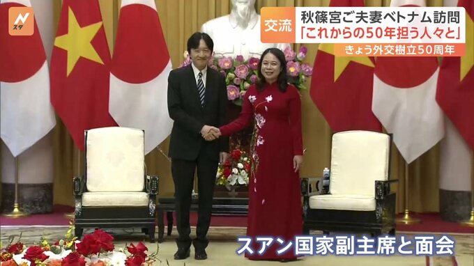 日本とベトナムが外交関係を樹立してから、ちょうど50年の節目を迎えたきょう、ベトナムを訪問中の秋篠宮ご夫妻は国家副主席と面会し、昼食会で両国関係の発展を願う挨拶をされました。日本時間正午ごろ、首都・ハ…
