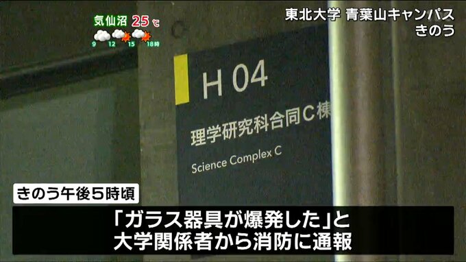 21日夕方、東北大学青葉山キャンパスで実験中にガラス器具が破裂する事故があり、学生3人がけがをして病院に運ばれました。3人とも意識はあり、命に別状はないということです。21日午後5時頃、仙台市青葉区荒巻の…