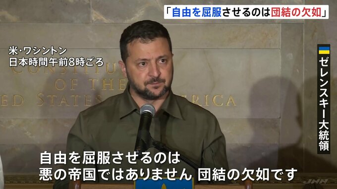 ウクライナのゼレンスキー大統領はさきほど、訪問先のワシントンで演説し、「自由を屈服させるのは団結の欠如だ」と述べ、アメリカとの団結の重要性を改めて強調しました。ウクライナ ゼレンスキー大統領「自由を…