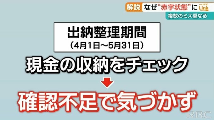 このミスは本来、4月1日から5月末までの「出納整理期間」に現金が実際にいくら入ってきたかをチェックしなければなりませんでしたが、担当部局はここでも不足を確認できませんでした。