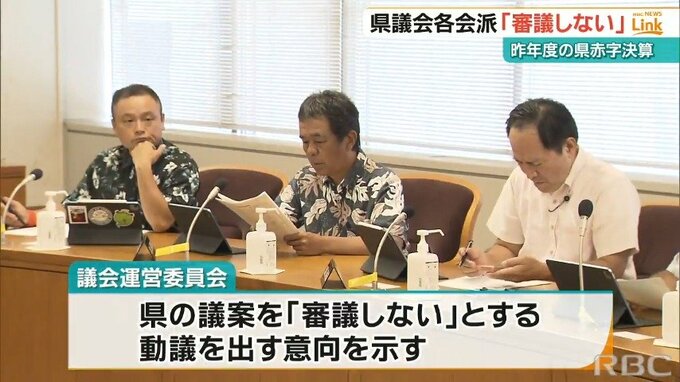 動議は各会派の全会一致で可決される見込みで、県議会で審議されなかった場合、地方自治法に基づき、玉城知事の専決処分で赤字状態解消のための予算執行が行われる見込みです。