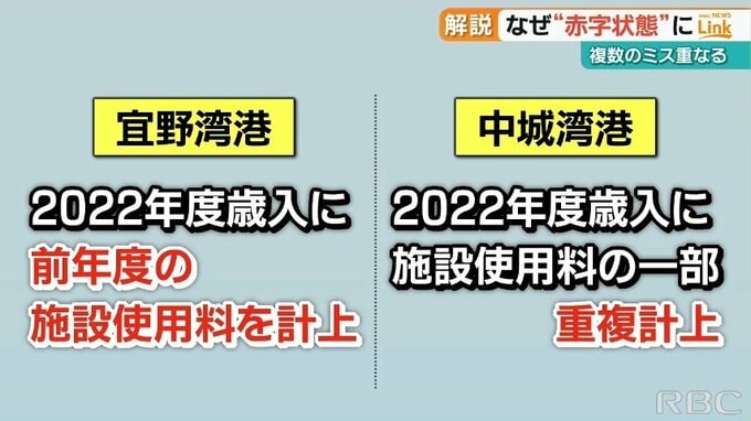 港湾の整備に関して県は、宜野湾港では昨年度の歳入に「その前の年の施設使用料」を計上するミス。中城湾港では施設使用料の一部を二重に計算するミスを犯していました。