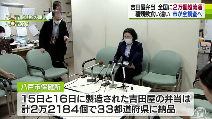 青森県八戸市の弁当製造会社「吉田屋」の弁当を食べ、体調不良などを訴えている人が全国で相次いでいる問題で、八戸市保健所は22日午前9時現在で33都道府県に流通状況の調査を実施し計2万2184個の弁当が製造・納品していたと公表しました。また、体調不良者は21日の発表から3人増えて301人になりました。一方で吉田屋は問題のあった弁当は12種類としていますが市は流通した59種類のうち異常のあった種類を絞り切れていなため全種類を調査するとしています。