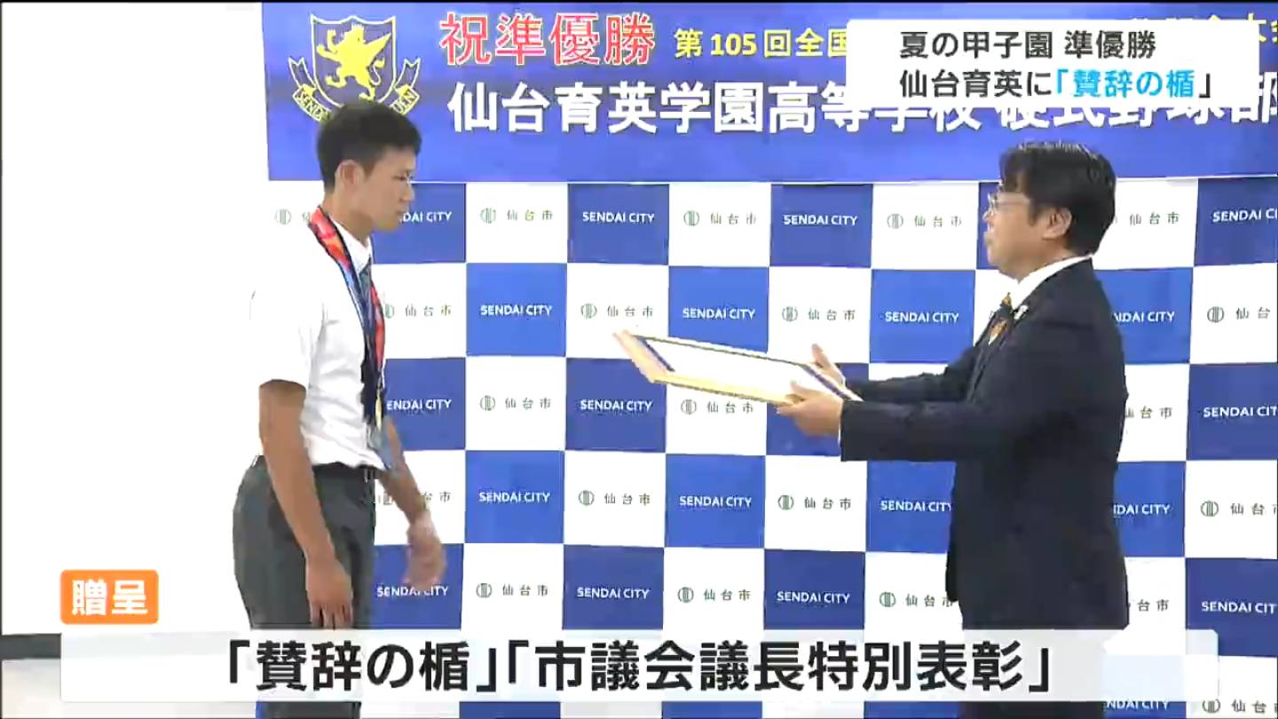夏の甲子園で準優勝に輝いた仙台育英学園高校野球部の選手たちに、仙台市から「賛辞の楯」が贈られました。